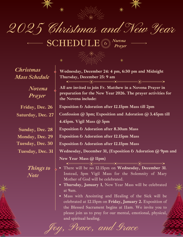 Note: The Parish Office will close for Christmas Break at 12 noon on Monday, December 22 and open on Monday, January 5, 2026.